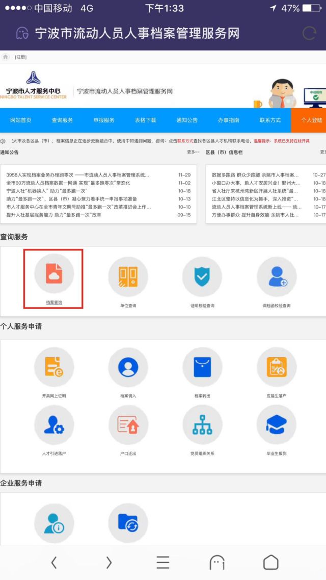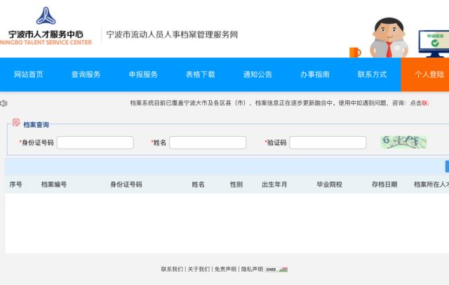 2、进入宁波市流动人员人事档案管理服务网,点击“档案查询”按钮。